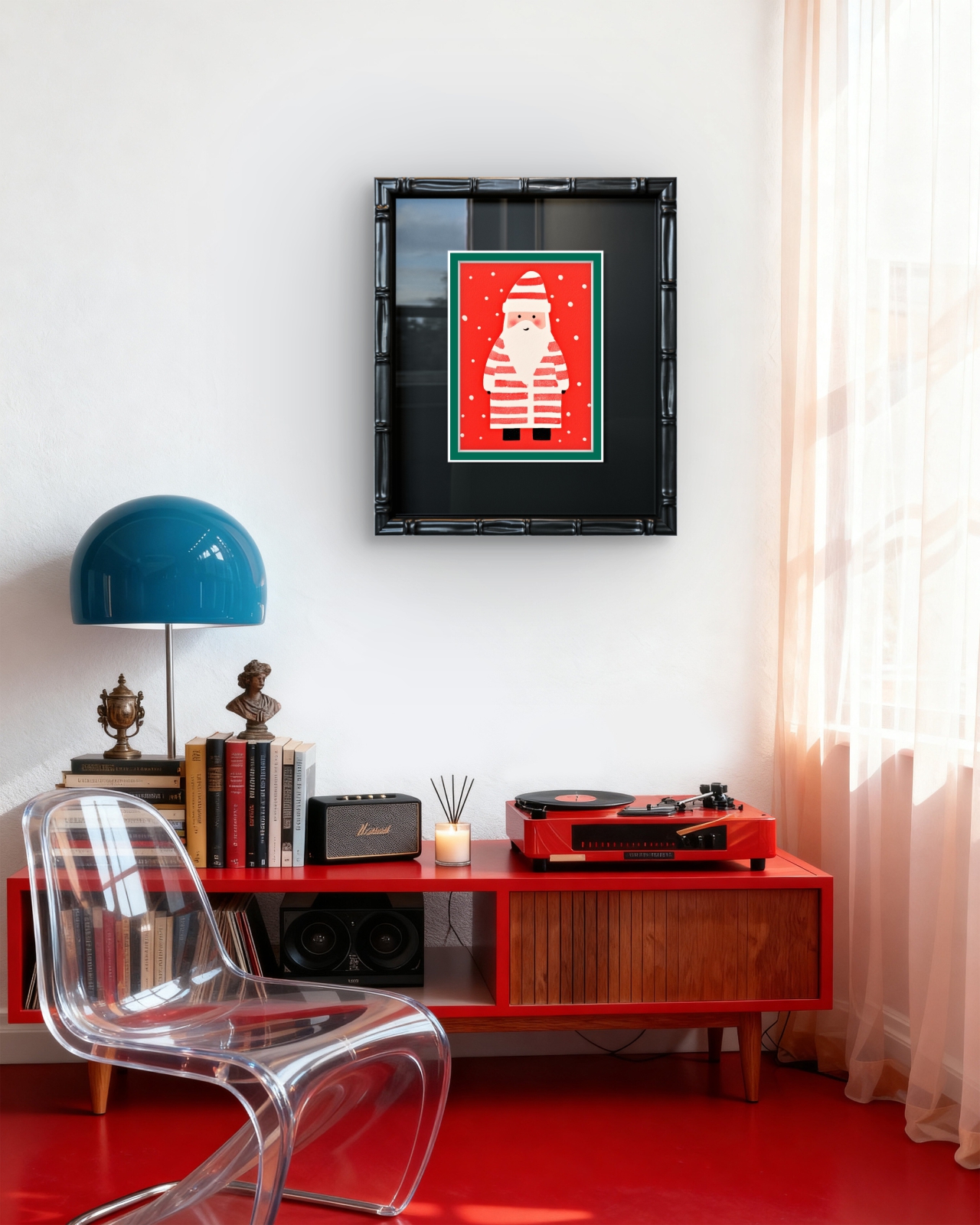 Lúc đầu mình hơi sợ màu đỏ Noel sẽ chói, nhưng khi treo lên thì hài hòa lắm. Không gian phòng khách trở nên ấm áp hơn. keke cho shop 100 điểm